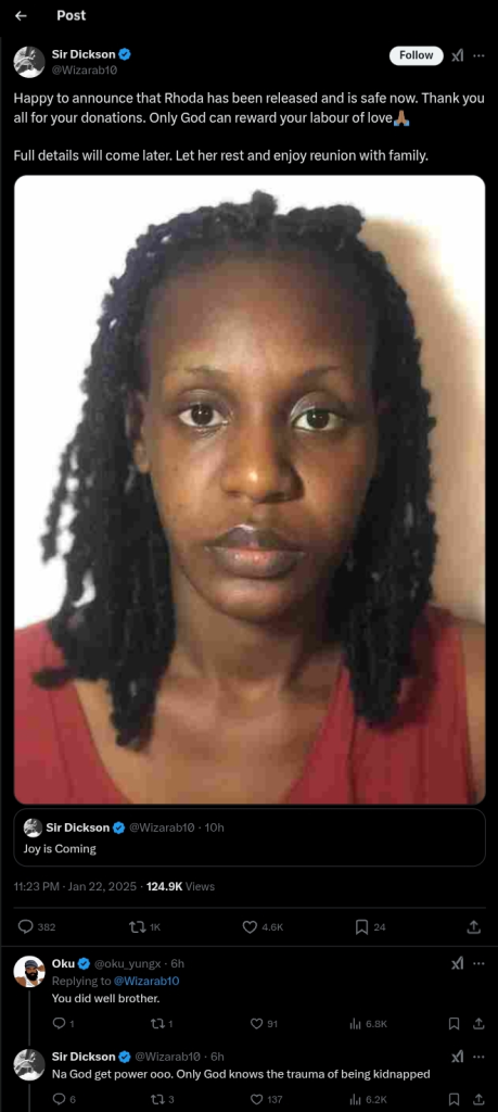 The influencer spearheaded a crowdfunding campaign, rallying support from Nigerians to meet the ransom demand. Within 24 hours of the fundraiser, the influencer confirmed Rhoda’s release in a heartfelt post, stating,